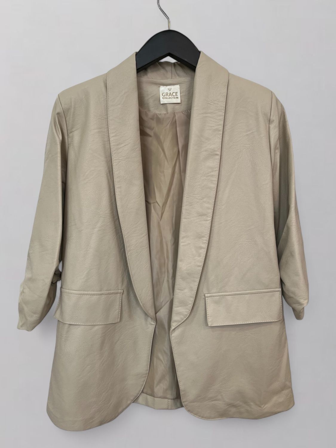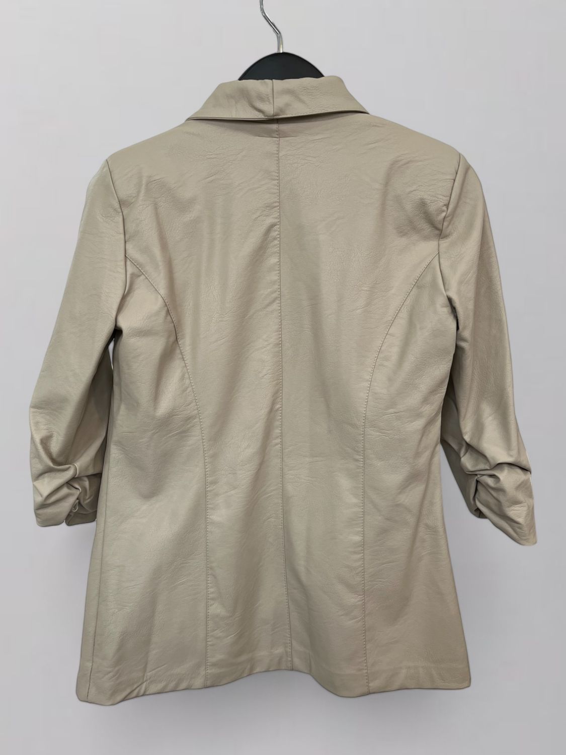 Blazer de eco cuero con manga fruncida. Talle único que va a un M/L.