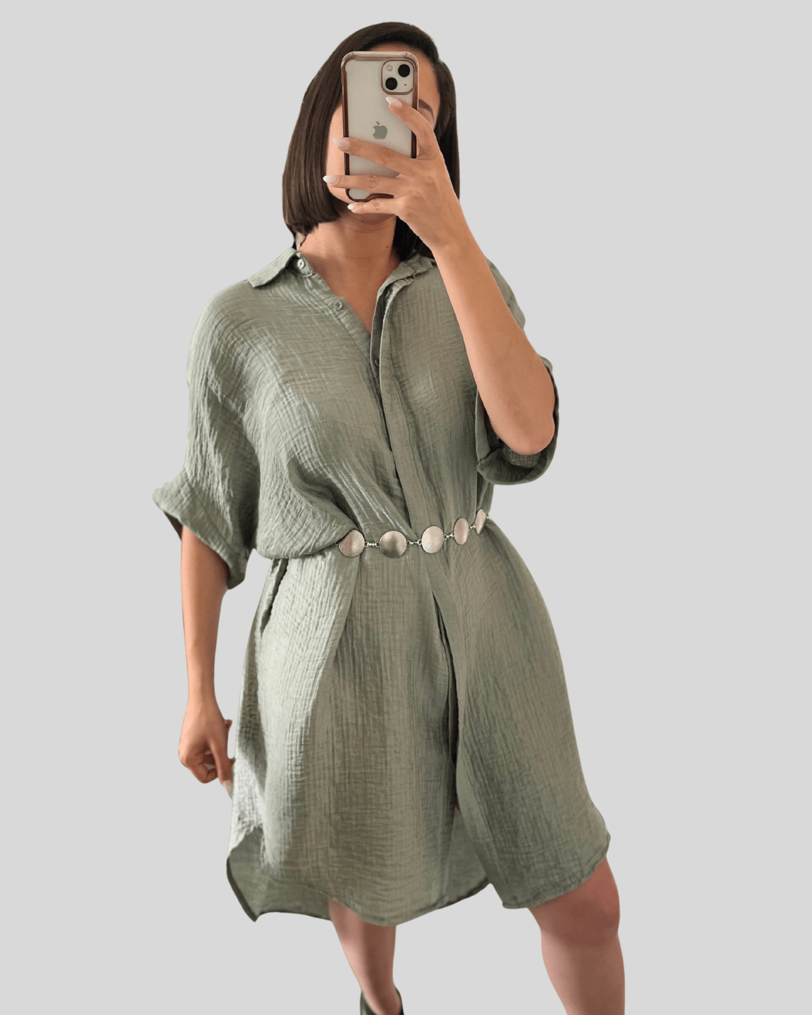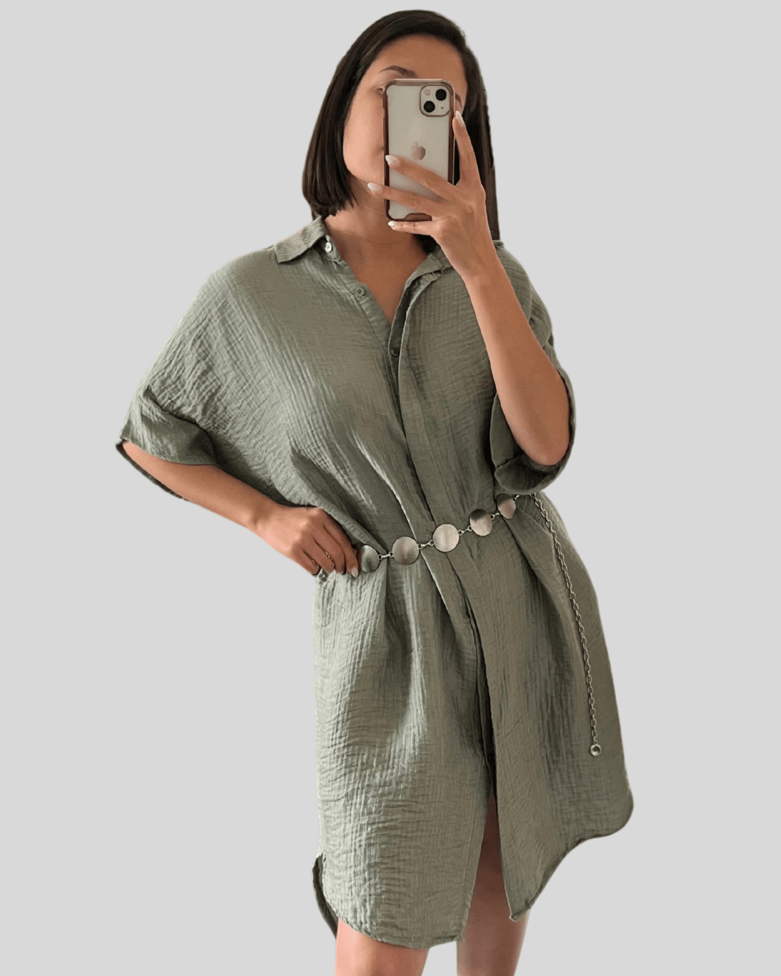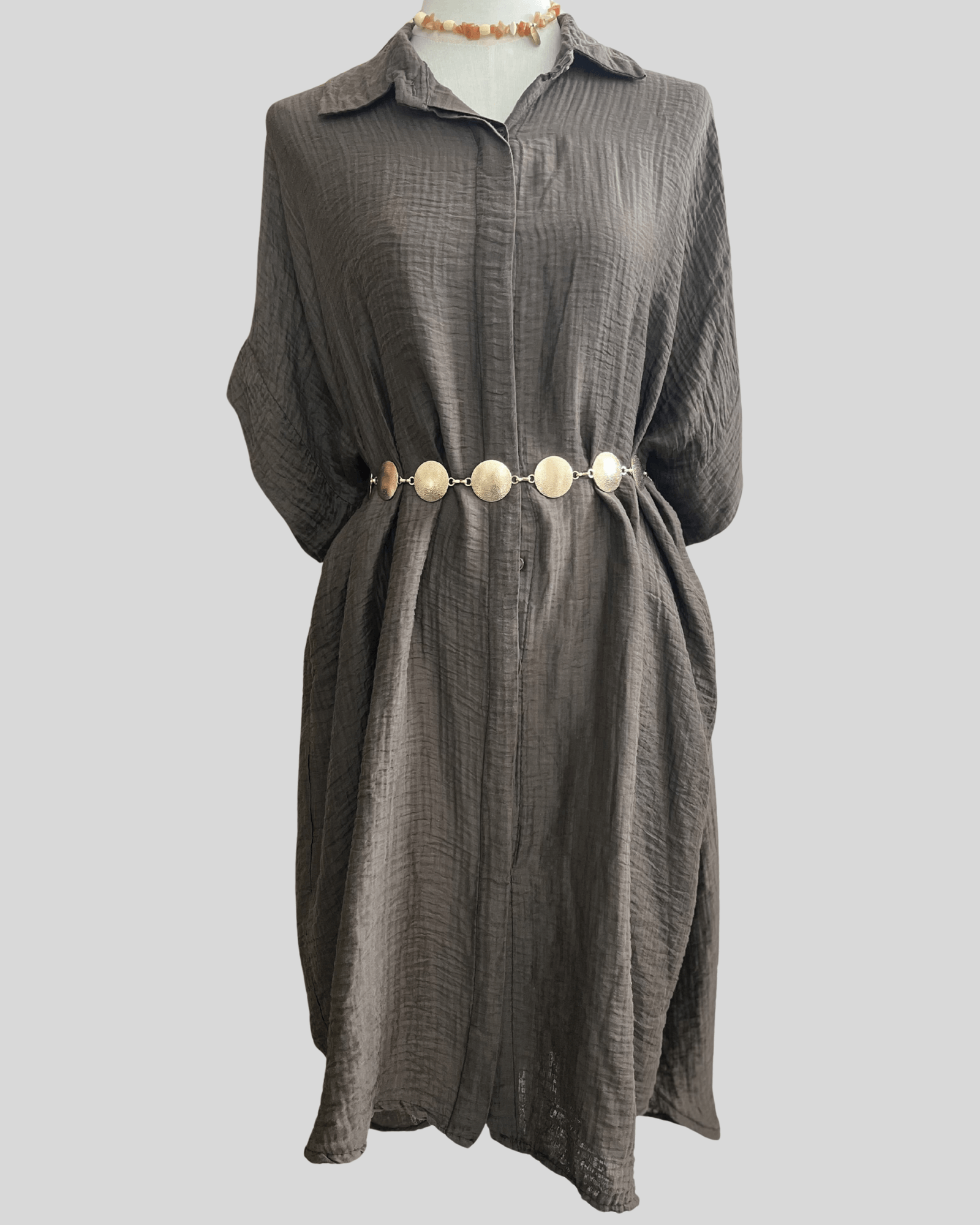 Camisa amplia, larga y de manga corta. Tiene bolsillos a los lados.