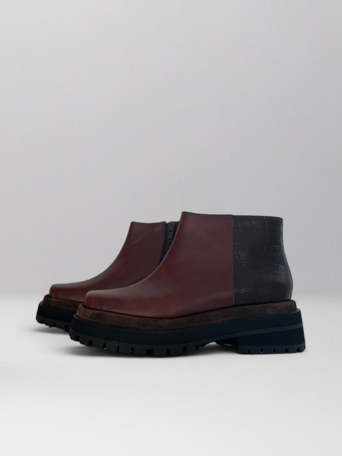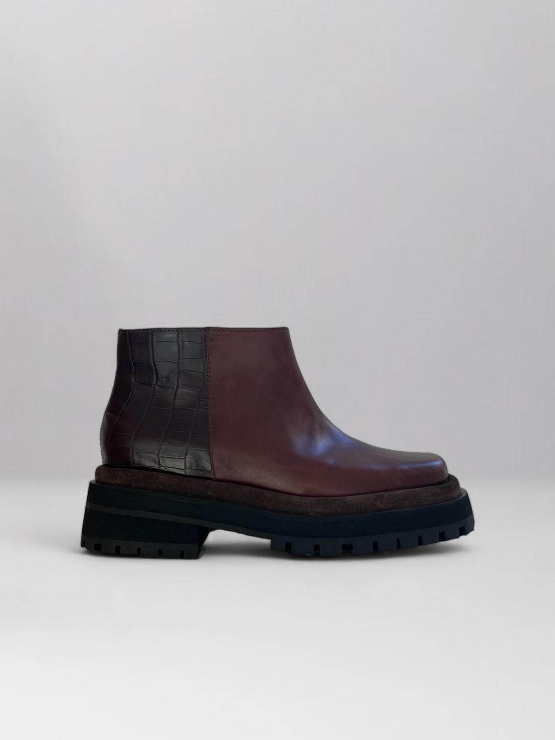 Bota de cuero corta, con plataforma. Cuero, industria uruguaya.
