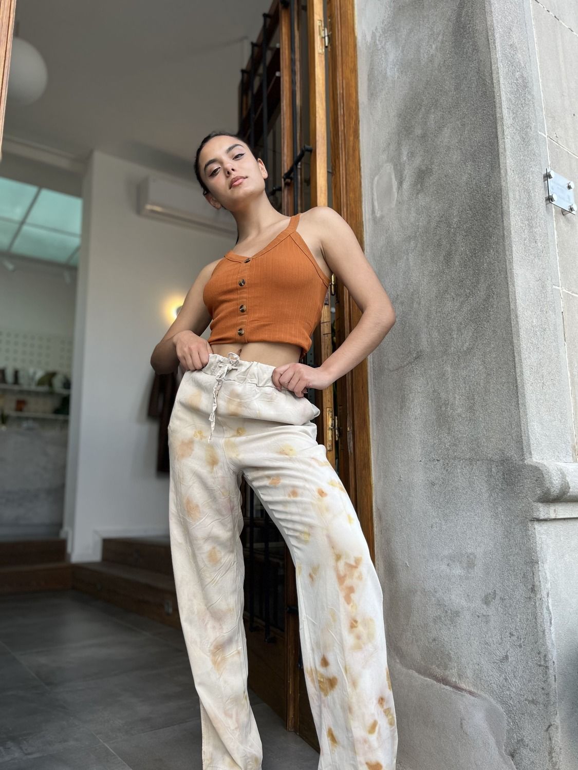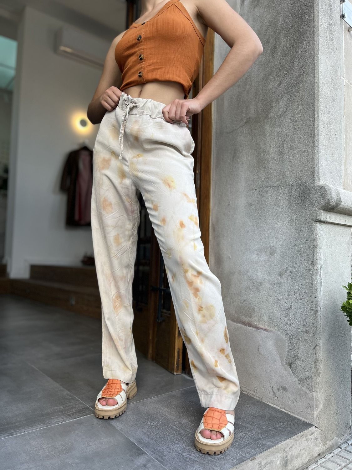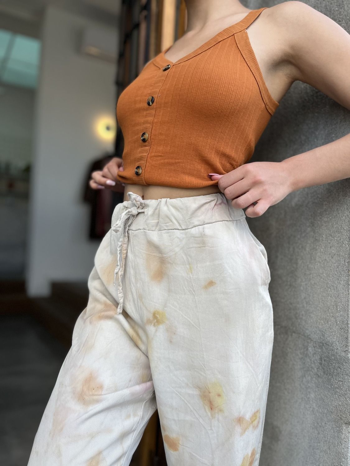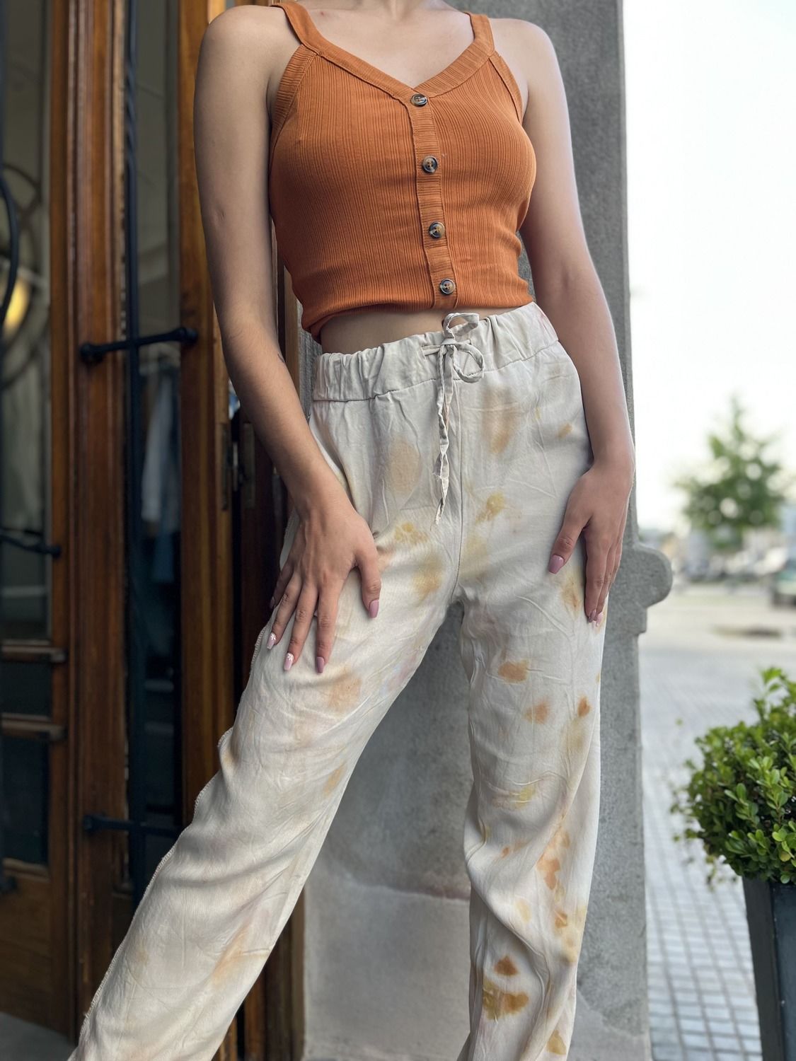 Pantalón con bolsillos, teñido con tintes naturales. Realizado por artesanas de nuestro departamento, gracias a las capacitaciones gratuitas brindadas por Grace junto a Ande.